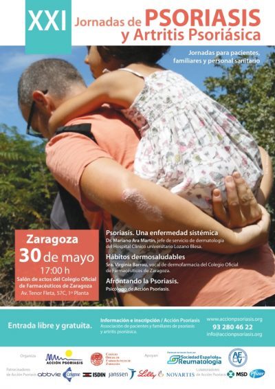 Acción Psoriasis, la asociación de pacientes de psoriasis y artritis psoriásica y sus familiares, y el COF de Zaragoza celebran la XXI edición del Día de la Psoriasis y la Artritis Psoriásica con la organización de una jornada dirigida a pacientes, familiares y personal sanitario, el próximo martes 30 de mayo, a las 17 horas, en la Sala de Actos del Colegio Oficial de Farmacéuticos de Zaragoza.