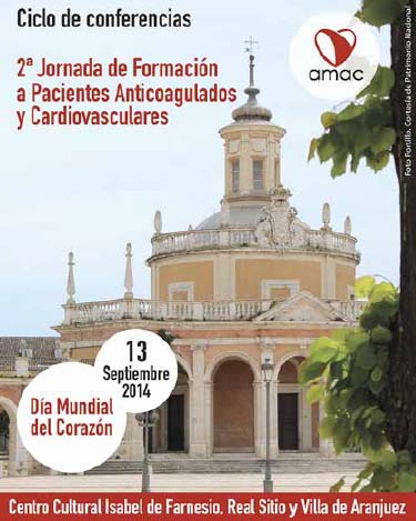 El próximo 13 de septiembre (sábado) tendrá lugar en el Centro Cultural Isabel de Farnesio, en Aranjuez, la 2ª Jornada de Formación a Pacientes Anticoagulados y Cardiovasculares, organizada por la Asociación Madrileña de Pacientes Anticoagulados (AMAC), con el apoyo del Ayuntamiento de Aranjuez y la Dirección Asistencial Sur de Atención Primaria del Servicio Madrileño de Salud.