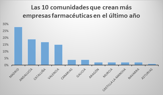 Si la capital del Estado, Andalucía y Valencia sobresalen en el comercio farmacéutico, el pastel de la fabricación de medicamentos en el último año se lo reparten, con diferencia, Madrid (con el 47% de las nuevas empresas creadas) y Cataluña (35%). Aunque la tendencia actual refleja el progreso de Andalucía en farmacia y un ligero retroceso de Cataluña, una fotografía estática del tejido empresarial farmacéutico pone de manifiesto la fortaleza que conserva la autonomía catalana, ya que el 20% de todas las compañías se ubican en esta región, igual que en Madrid y por delante de Andalucía (17%) y la Comunidad Valenciana (10%).