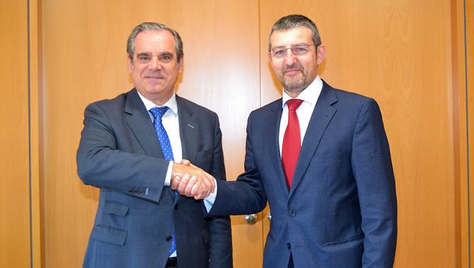 *En la imagen, Jesús Aguilar, presidente del Consejo General de Farmacéuticos, y Andoni Lorenzo, tras la firma del convenio de colaboración