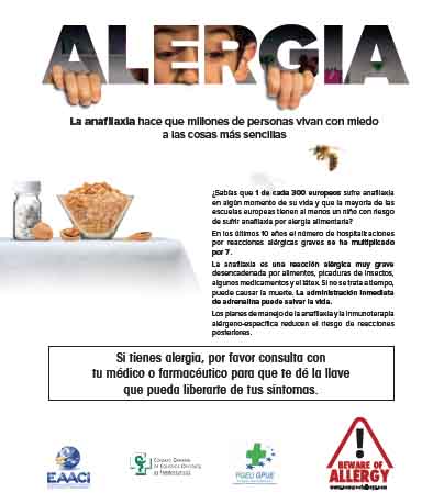 Las farmacias españolas, a través de la Agrupación Farmacéutica Europea (PGEU), se suman desde hoy a una campaña paneuropea de sensibilización sobre anafilaxia – reacciones alérgicas graves – y alergias alimentarias, promovida por la Academia Europea de Alergia e Inmunología Clínica (EAACI). El objetivo de esta iniciativa – desarrollada por el Consejo General de Farmacéuticos en colaboración con la vocalía nacional de Alimentación – es promover la educación sanitaria y avanzar en la prevención desde las farmacias, ante la progresiva incidencia que se está produciendo en toda Europa, tanto de anafilaxia como de alergias alimentarias. Con este fin las farmacias dispondrán de material gráfico y los farmacéuticos ofrecerán consejos sobre prevención y tratamiento.
