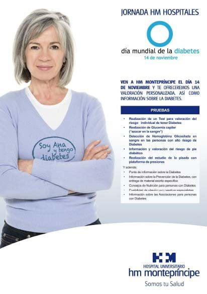 Este viernes 14 de noviembre, se celebra el Día Mundial de la Diabetes y HM Montepríncipe se une a este día con una jornada dedicada íntegramente a esta enfermedad. De 9:30 a 19:30 horas en las instalaciones del hospital (frente a cafetería), se habilitará un punto de información donde se realizarán de forma gratuita y personalizada diversas pruebas a todo aquel que lo solicite: