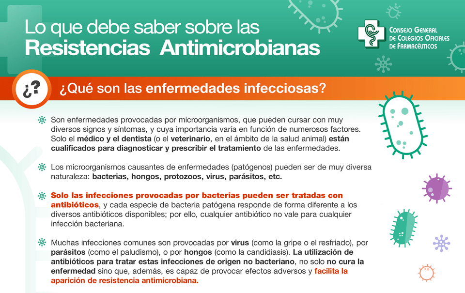 La red asistencial de 22.000 farmacias en España, con 48.500 farmacéuticos comunitarios, constituye una estructura sanitaria fundamental para mejorar la educación sanitaria a la población. Asimismo, como soporte a la labor de consejo sanitario, los farmacéuticos cuentan con material divulgativo dirigido a los pacientes, disponible en www.portalfarma.com, que recoge la información más importante sobre qué son las enfermedades infecciosas, por qué aparecen las resistencias antimicrobianas y cómo se difunden.