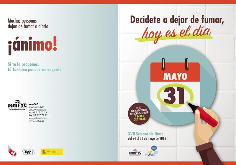 El martes 24 de mayo arranca la XVII Semana sin humo, que este año se desarrollará con el lema «Decídete a dejar de fumar, hoy es el día». Una inciativa de la Sociedad Española de Medicina de Familia y Comunitaria en la que centros de salud de toda España pondrán especial empeño desde ese día y hasta el 31 de mayo, Día Mundial Sin Tabaco, en ayudar a los ciudadanos que pasen por la consulta a dejar de fumar. Este año será bajo el lema Decídete a dejar de fumar, hoy es el día. Y como en ediciones previas los médicos de familia han preguntado los últimos meses a la población por distintos aspectos relacionados con el hábito tabáquico, especialmente sobre el empaquetado genérico, la exposición al humo ambiental, la reglamentación del cigarrillo electrónico, el incremento del precio y la financiación de los tratamientos para dejar de fumar.
