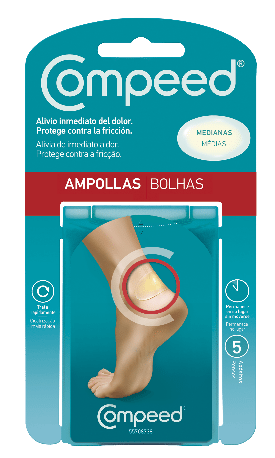 Los apósitos de COMPEED® Ampollas, con su tecnología hidrocoloide, actúan como una segunda piel ofreciendo alivio instantáneo del dolor, protección y amortiguamiento frente a roce y rápida cicatrización de la herida. Permanece en su lugar varios días. Sus diferentes tamaños permiten la cicatrización de cada herida, esté en la parte del pie que esté.