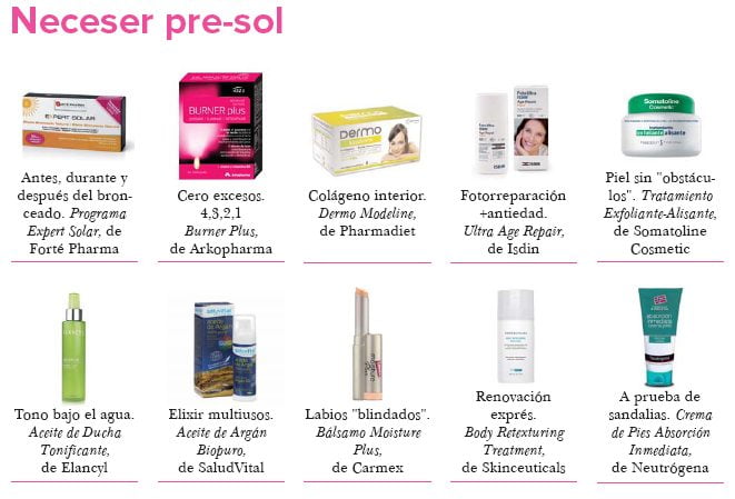 Preparadores del bronceado. Son productos ricos en betacarotenos (sustancias de reconocido poder antioxidante que, además, favorecen la pigmentación homogénea de la piel), vitaminas C y E y selenio (ingredientes todos de ellos con una importante acción antiradicales libres). Los productos de nueva generación incorporan además componentes como el cobre (ayuda a la pigmentación de la piel) y la L-Tyrosina (una sustancia que estimula la producción de melanina para proteger mejor de la acción solar nociva). Lo ideal es empezar a consumir estos productos como mínimo unos 15 días antes de iniciar la exposición al sol.
