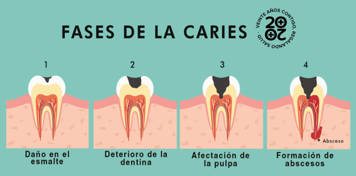 Las caries que se forman en la superficie exterior del esmalte no suelen causar dolor ni síntomas, pero a medida que la caries llega más allá del esmalte y llega a la dentina y la pulpa puede ocasionar dolor y provocar un flemón o hinchazón.