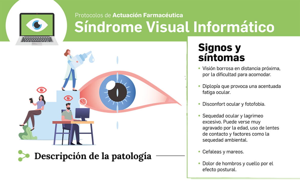El Síndrome Visual Informático es definido como el conjunto de problemas oculares relacionados con el uso continuado de la visión de cerca y con el manejo de ordenadores, tablets y smartphones. El SVI puede afectar al 90% de las personas que hacen uso de dispositivos durante más de 3 horas diarias. Los síntomas que origina a veces desaparecen al cesar la actividad pero en otras ocasiones permanecen, reduciendo la salud visual del usuario. Entre los síntomas más frecuentes encontramos dolor de cabeza, cuello y hombros, así como cansancio visual, picor de ojos, sequedad ocular, visión borrosa, hipersensibilidad a la luz e irritación ocular entre otros.
