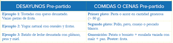 Como hemos mencionado, es muy importante llegar a los partidos con las reservas de glucógeno al máximo. Eso se consigue teniendo una alimentación rica en hidratos de carbono, especialmente previo a los partidos.