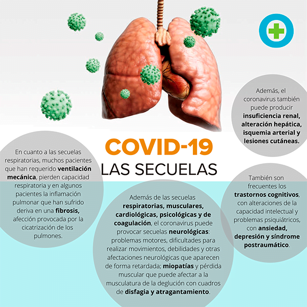 Además de las secuelas respiratorias, musculares, cardiológicas, psicológicas y de coagulación, el coronavirus puede provocar secuelas neurológicas que hay que vigilar tanto al ingreso como al alta y durante las primeras semanas. Así lo afirma el doctor Iván Moreno, internista y portavoz de la Sociedad Española de Medicina Interna (SEMI), quien refiere fundamentalmente problemas motores, dificultades para realizar movimientos, debilidades y otras afectaciones neurológicas que aparecen de forma retardada, miopatías y pérdida muscular que puede afectar a la musculatura de la deglución con cuadros de disfagia y atragantamiento, etc. En cuanto a las secuelas respiratorias, “muchos pacientes que han requerido ventilación mecánica, pierden capacidad respiratoria y en algunos pacientes la inflamación pulmonar que han sufrido deriva en una fibrosis, afección provocada por la cicatrización de los pulmones, de manera que se genera un tejido más grueso y duro que ocasiona dificultades para respirar. También son frecuentes los trastornos cognitivos, con alteraciones de la capacidad intelectual y problemas psiquiátricos, con ansiedad, depresión y síndrome postraumático. Además, el coronavirus también puede producir insuficiencia renal, alteración hepática, isquemia arterial y lesiones cutáneas”, afirma el experto. “Otra cosa que desgraciadamente estamos observando es que muchos pacientes en UCI o ya dados de alta vuelven con infecciones oportunistas por el hecho de haber abusado de los inmunosupresores durante el tratamiento en el hospital”.