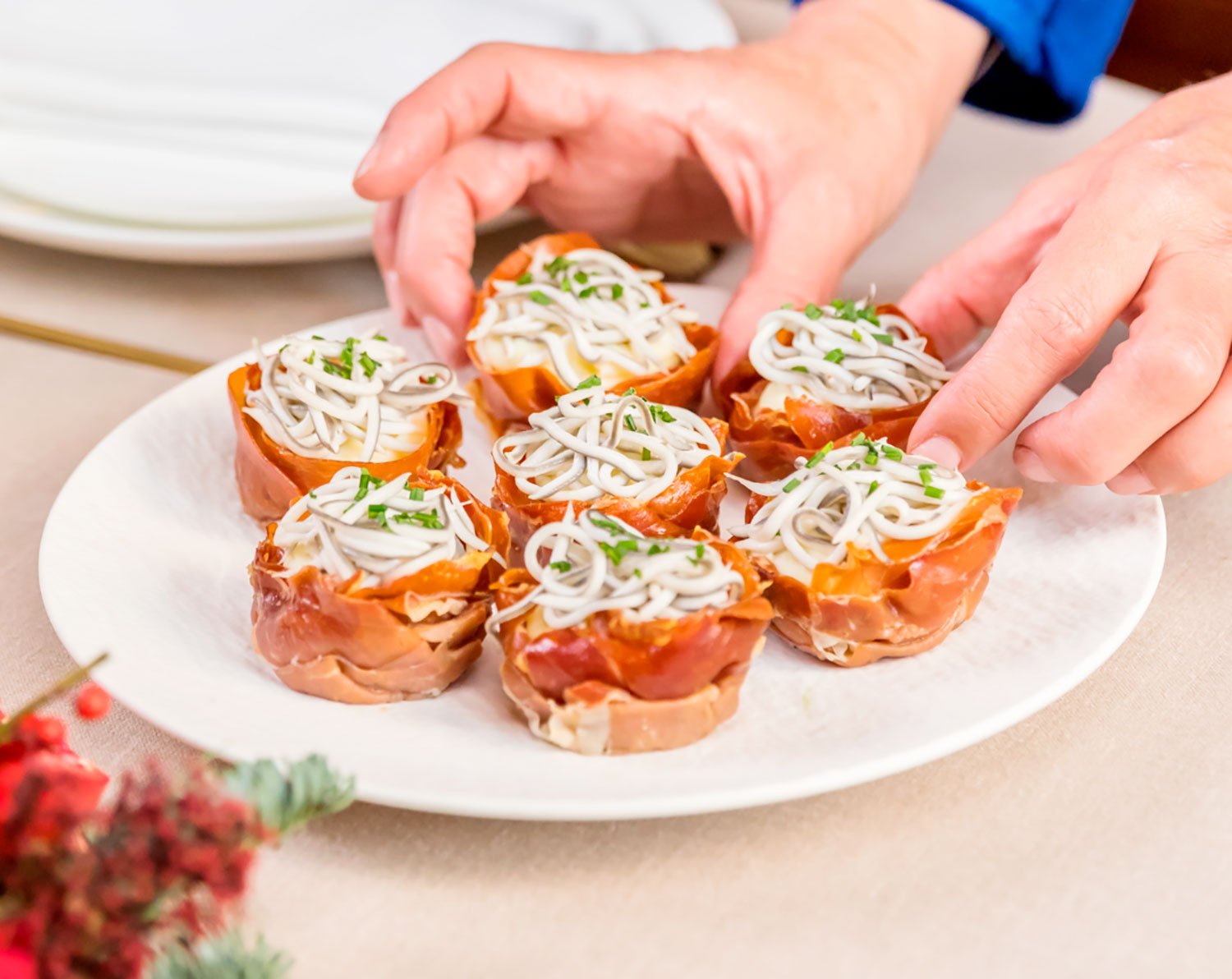 Vamos a empezar precalentando el horno a 180°C. A continuación, en unos molde para magdalenas, colocamos el jamón forrando la base y la paredes formando cestas. Pincelamos ligeramente con aceite o utilizamos un spray y los metemos en el horno unos 10 minutos o hasta que este ligeramente doradas y crujientes. Sacamos del horno y reservamos, hay que esperar a que se enfríen para poder desmoldar. Nos ponemos con el puré de patata, para ello pelamos las patatas y las cocemos enteras en una olla con agua con sal hasta que estén tiernas. Una vez listas, las sacamos, escurrimos del agua y las aplastamos con un tenedor o pasapurés. Añadimos la leche y la mantequilla, mezclamos bien y salpimentamos. Picamos los ajos en láminas y en una sartén con un chorrito de aceite de oliva los doramos, añadimos las gulas y calentamos. Disponemos en un plato las cestas de jamón, en la base colocamos el puré de patatas y encima las gulas salteadas.