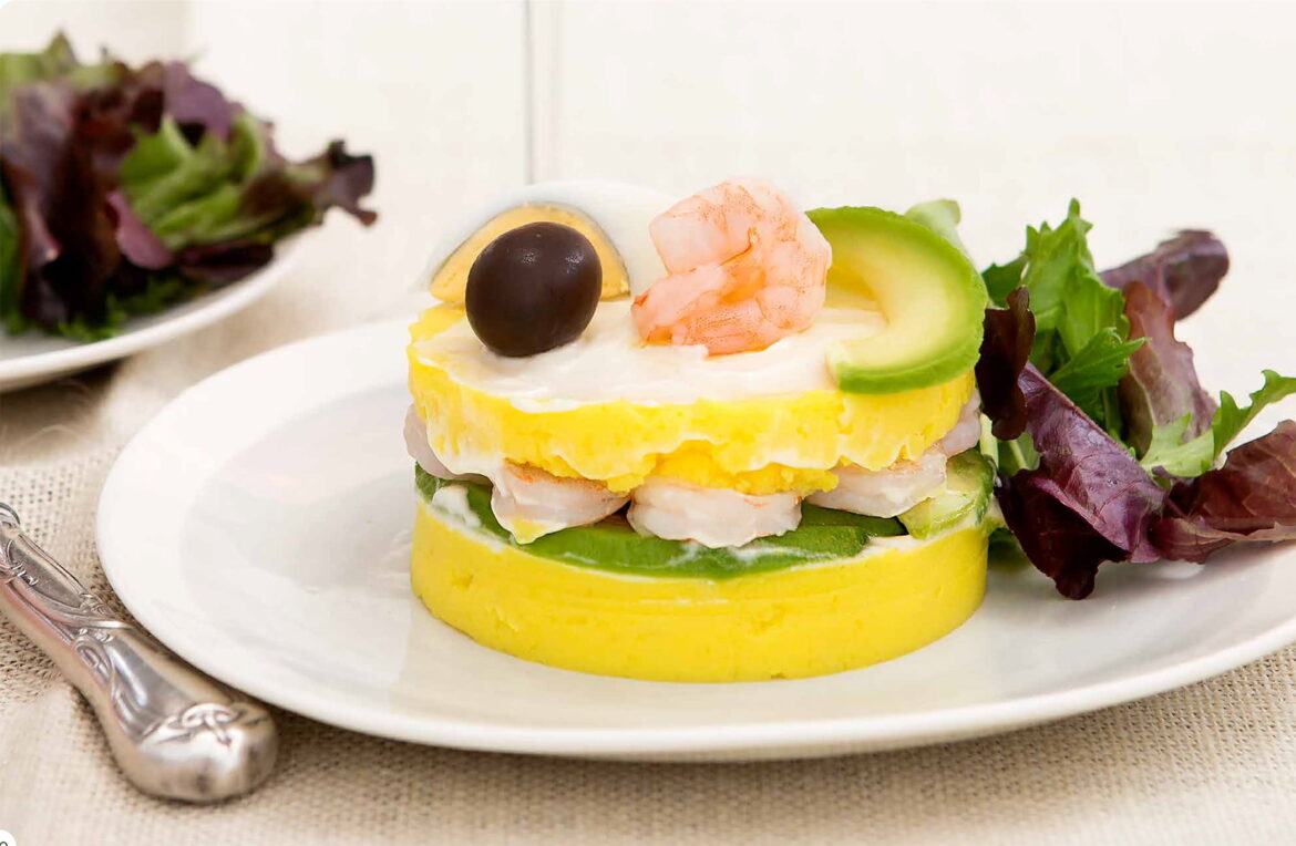 En un molde rellenar la base con la mitad de la mezcla de patatas, cubrir con una capa de mayonesa con cebolla, distribuir el aguacate laminado cubriendo toda la superficie y poner los langostinos. Tapar con el resto de las patatas, desmoldar en un plato y cubrir con la mayonesa de limón, decorar con rodajas del aguacate, colas de langostinos, aceitunas y huevo duro. Se puede servir acompañado de lechuga
