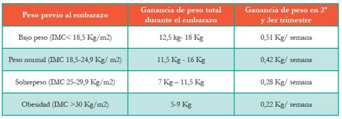 Uno de los aspectos principales por los que una mujer embarazada acude a la consulta de un dietista-nutricionista es controlar su ganancia de peso durante este periodo. Es muy importante recalcar que no se recomienda la aplicación de dietas restrictivas con objetivo de perder peso. Sin embargo, en función del peso corporal e IMC de partida, sí existen unas recomendaciones de ganancia de peso, el cual podrá ser en mayor o menor medida en función de este peso inicial. A continuación, os mostramos en la siguiente tabla cuál sería esta recomendación de ganancia de peso según el “Institute of Medicine, EEUU”: