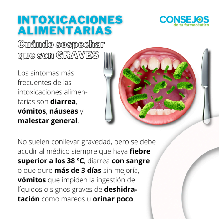 Los síntomas más frecuentes de las intoxicaciones alimentarias son diarrea, vómitos, náuseas y malestar general. No suelen conllevar gravedad, pero se debe acudir al médico siempre que haya fiebre superior a los 38 ºC, diarrea con sangre o que dure más de tres días sin mejoría, vómitos que impiden la ingestión de líquidos o signos graves de deshidratación como mareos u orinar poco.